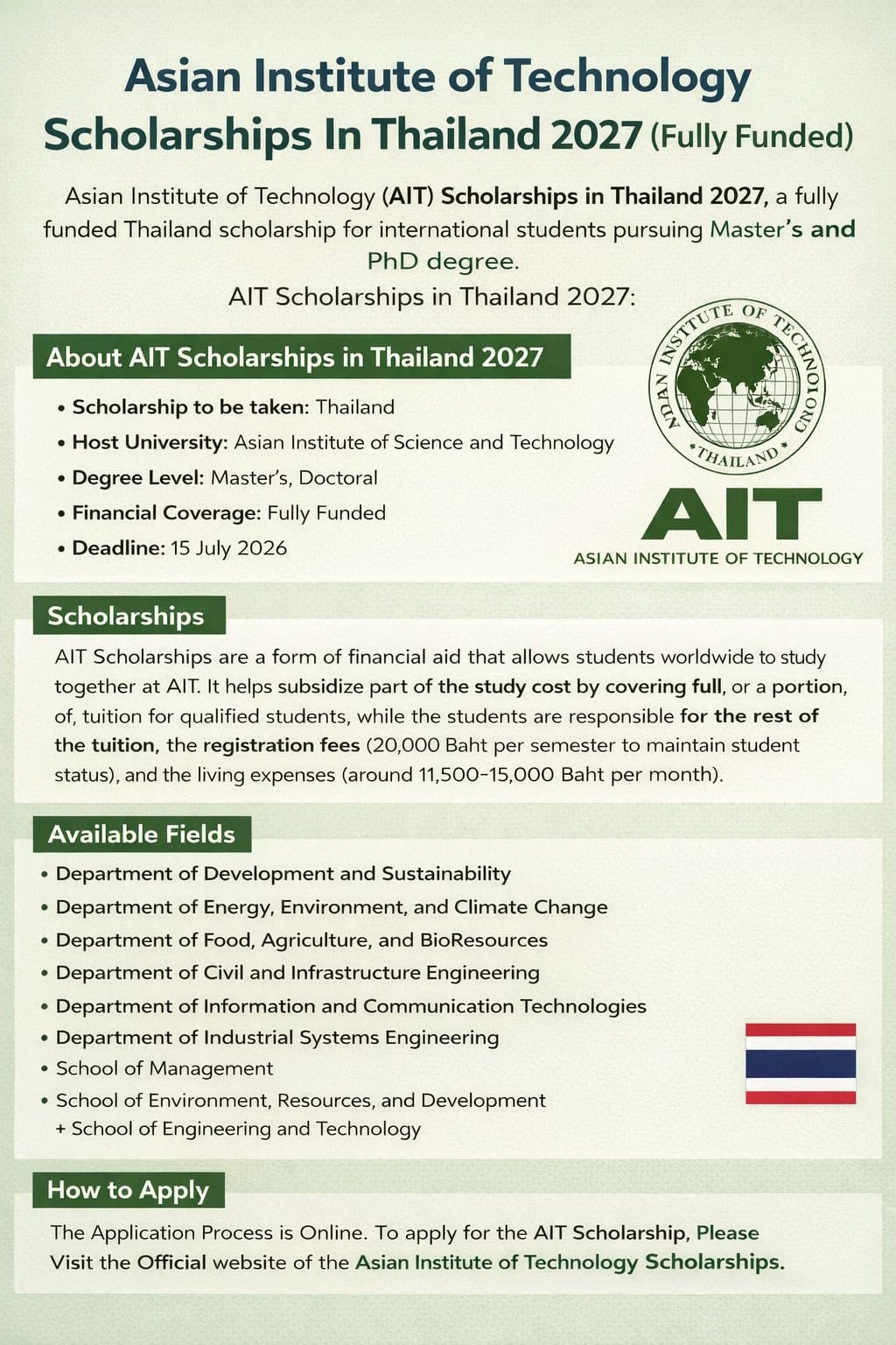 The application process is entirely online. Interested candidates should visit the official AIT Scholarships website to submit their applications before the deadline.