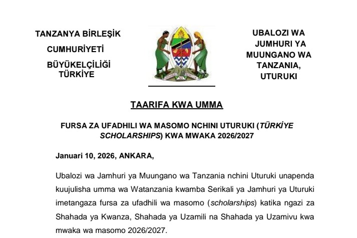 Serikali ya Jamhuri ya Uturuki imetangaza rasmi fursa za ufadhili wa masomo (Türkiye Scholarships) kwa mwaka wa masomo 2026/2027. Tangazo hili limetolewa kupitia Ubalozi wa Jamhuri ya Muungano wa Tanzania nchini Uturuki likiwahimiza Watanzania wenye sifa kuomba nafasi hizi muhimu za masomo ya juu.